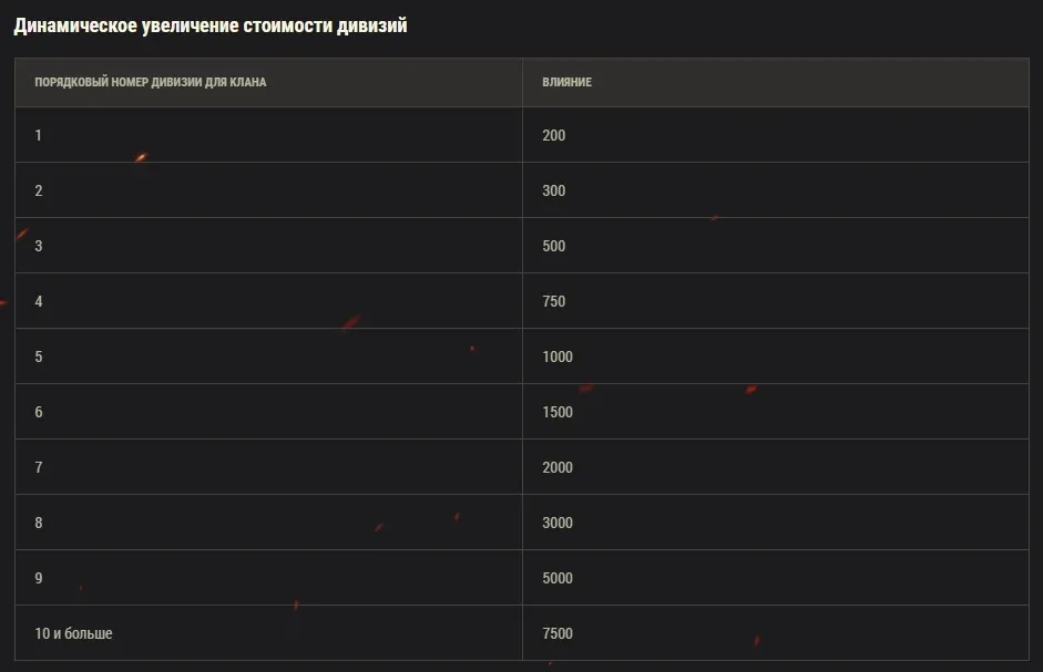 - Базовая стоимость дивизии — 200 единиц влияния. Стоимость дивизий увеличивается в зависимости от количества дивизий у клана.