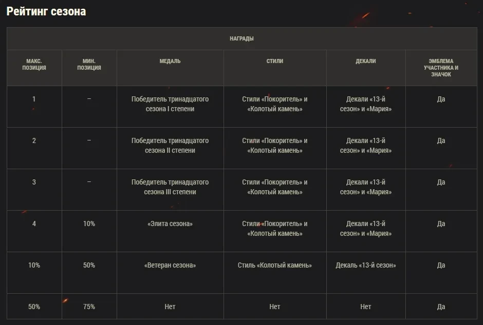 Клановую награду получат игроки, состоящие в клане-призёре на момент окончания сезона, а также сыгравшие 5 и более боёв на Глобальной карте в 13-м сезоне.