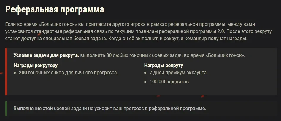 Если во время «Больших гонок» вы пригласите другого игрока в рамках реферальной программы, между вами установится стандартная реферальная связь по текущим правилам реферальной программы 2.0. После этого рекруту станет доступна специальная боевая задача. Когда он её выполнит, и рекрут, и командир получат награды.
