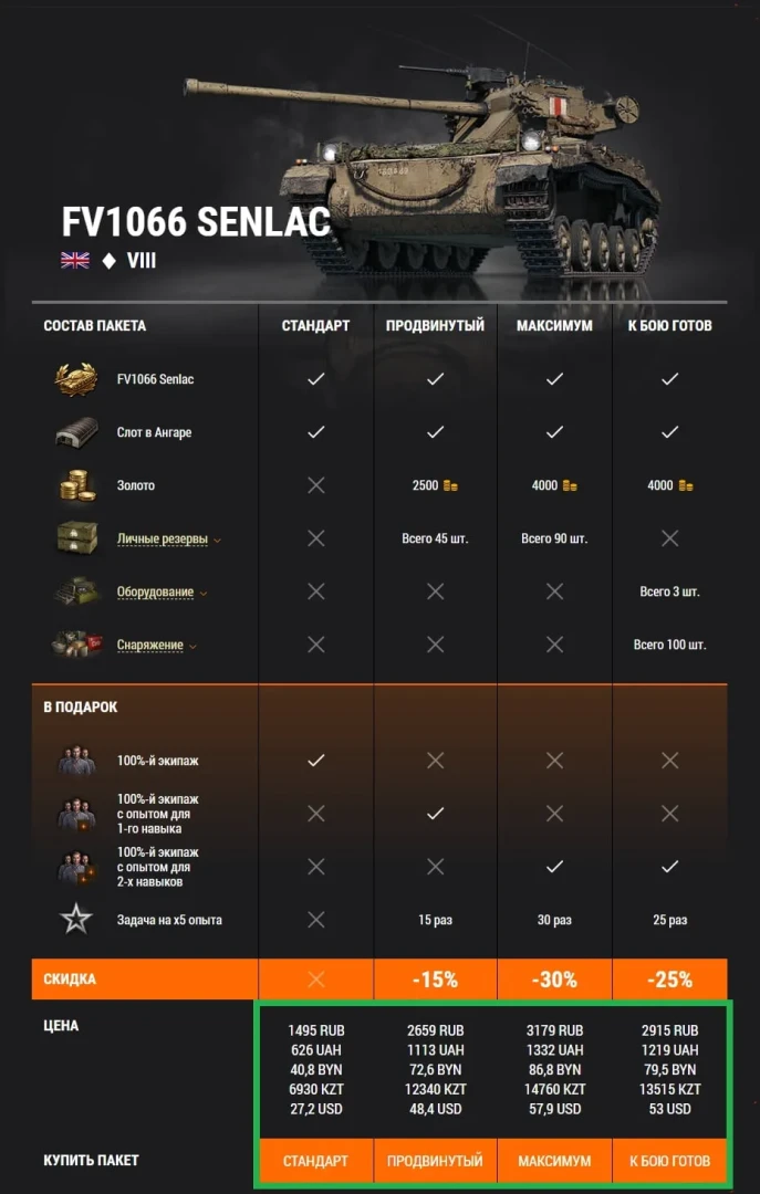 Если вы покупаете пакеты, когда FV1066 Senlac у вас уже есть, то вы получите остальное имущество из них (слоты, экипаж, игровое золото, личные резервы, снаряжение, оборудование, боевую задачу), кроме самой машины. За неё вам будет начислена компенсация игровым золотом: 6.500.