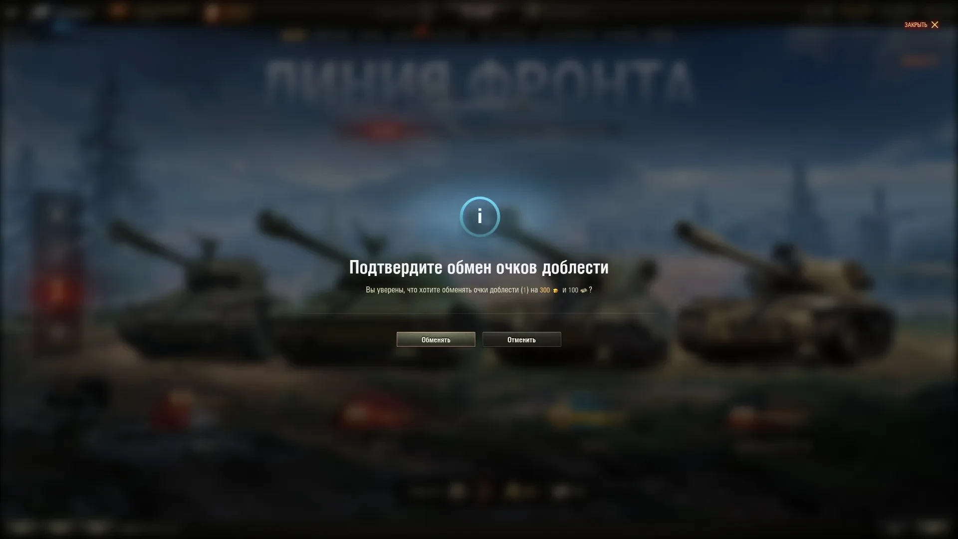 Обмен производится в окне выбора машины в интерфейсе «Линии фронта»: Селектор выбора режимов ==> Линия фронта ==> Нажать на Ваш уровень сверху ==> Награды (слева 3 в колонке) ==> Нажать в самом низу «Обменять».