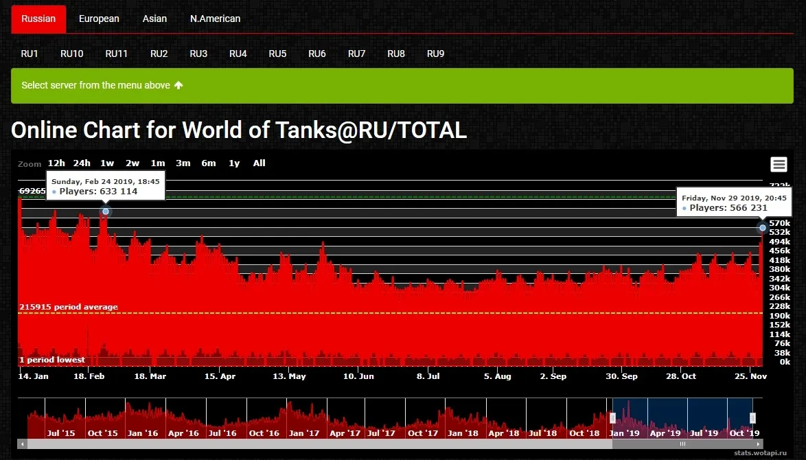 Сегодня, кстати, онлайн только на RU сервере World of Tanks пробил отметку в 550k (суммарный 720k), а на выходных, в воскресенье должно быть ещё больше. Последний раз такое было на 23-24 февраля 2019 года.
