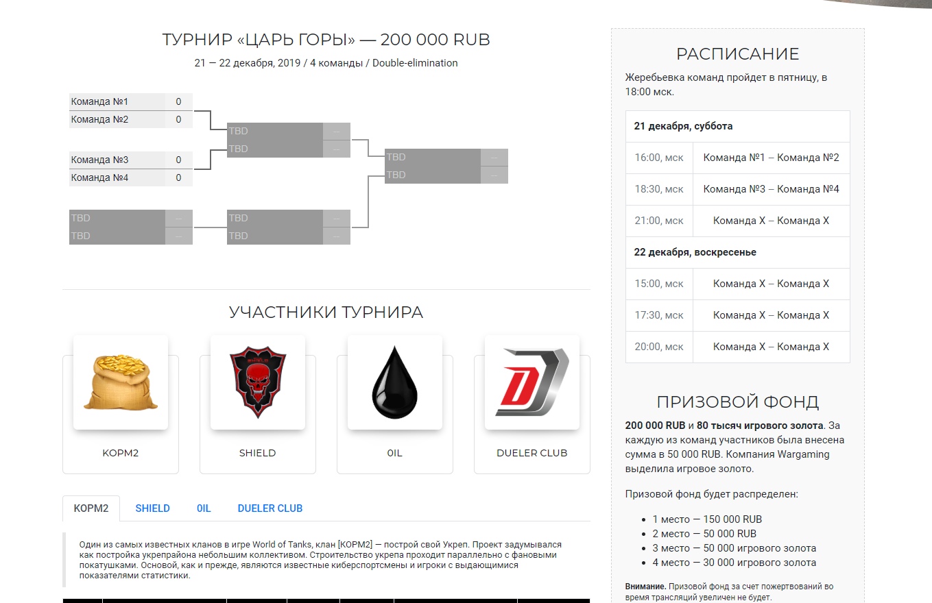 Пройдёт турнир в эти выходные среди лучших команд RU-региона WOT (KOPM2, SHIELD, 0IL и DUELER CLUB) в редком формате 15/150 (Атака/Оборона). Призовой фонд также имеется, так что не пропустите событие, которые организовывают сами игроки.