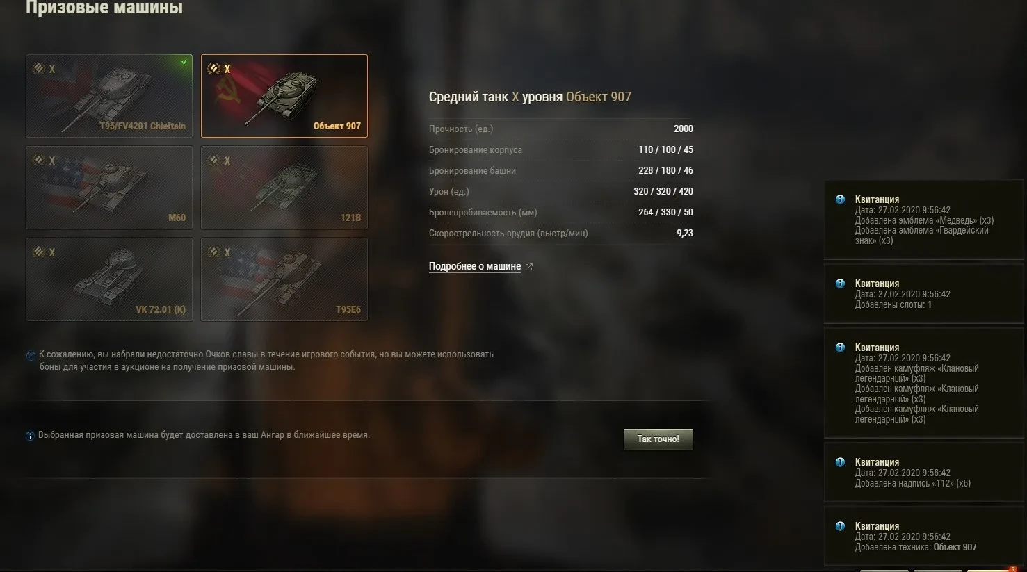 * Забрать свой танк, обменять очки славы на призовые бонусы или сделать ставку на боновом аукционе можно будет до 12 марта 05:59 (МСК).