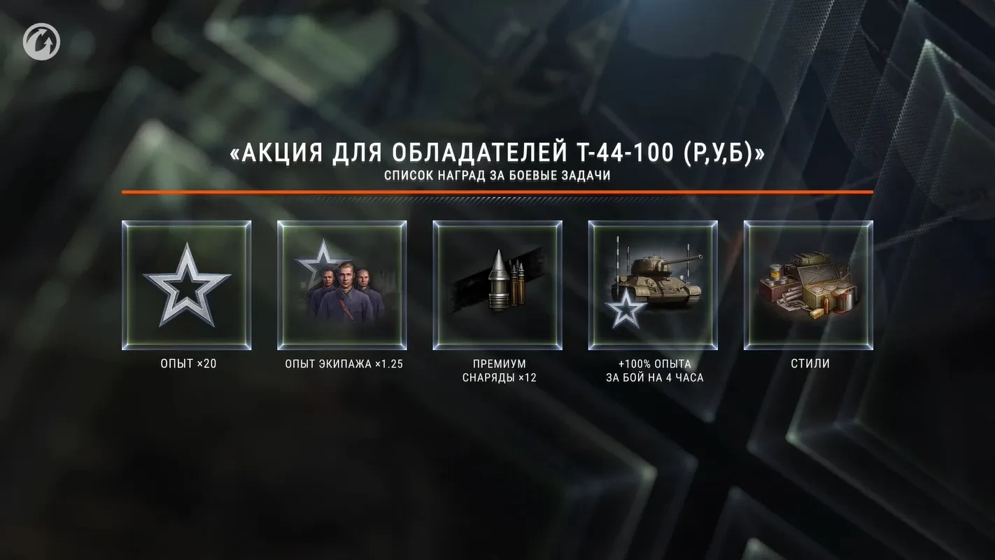 [15 апреля 2020 г.- 15 апреля 2022 г.] 15 апреля 2020 г. c 09:00 (МСК) стали доступны новые ежегодные БЗ для танков телекомов: Т-44-100 (Р), Т-44-100 (У) и Т-44-100 (Б). Впервые открыто стали доступны новые 2D-стили.