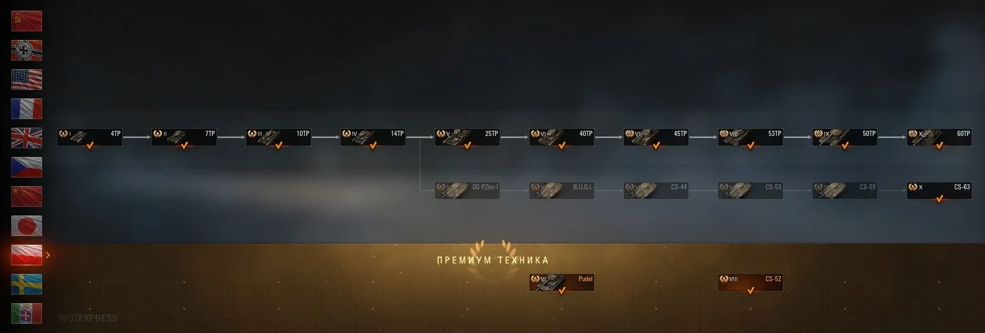 Всего 7 новых танков, 6 прокачиваемых и 1 прем танк. В целом, машин много. По поводу перехода. Накопить нужно будет примерно 13-14 тыс. опыта на 14TP, дабы открыть себе сразу 5 уровень: DS PZlnz-I.