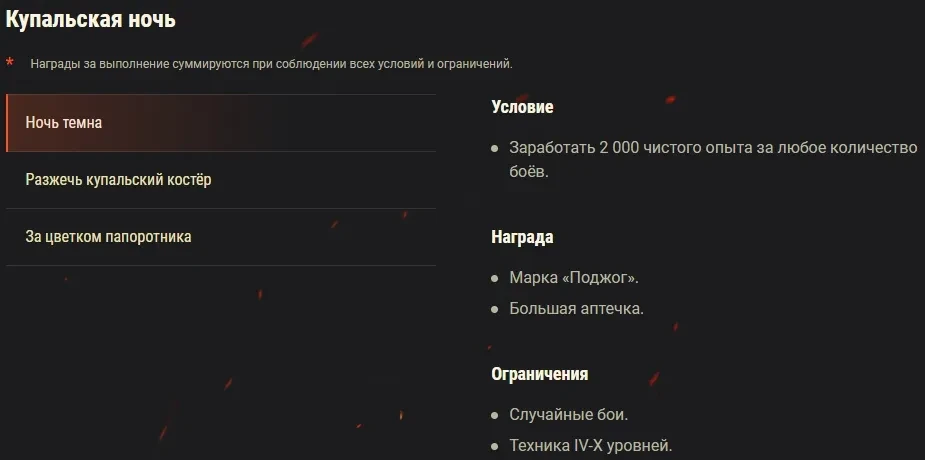 **** Боевые задачи доступны с 6 июля 9:00 (МСК) по 13 июля 8:30 (МСК) для тех, кто активировал код: KUPALSKAYANOCH.