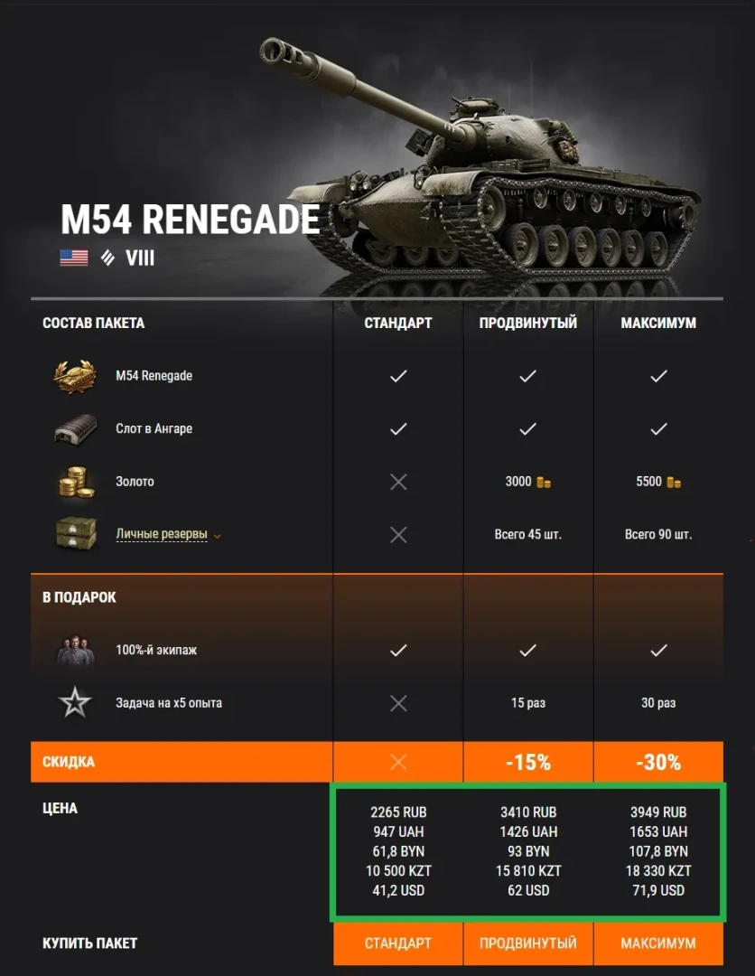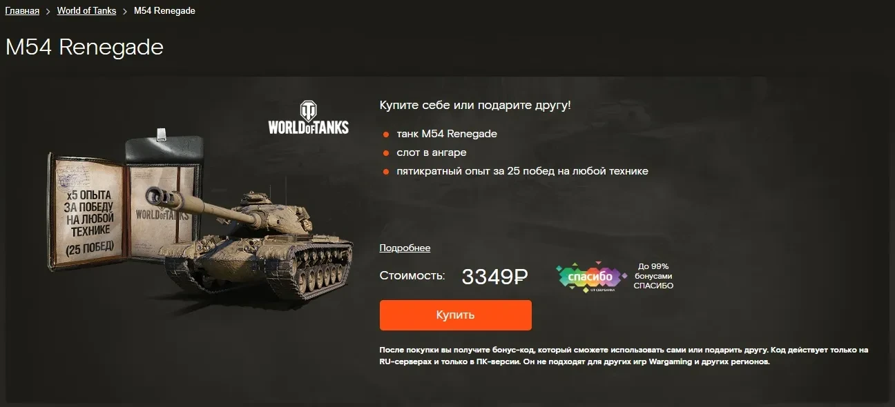 Если у вас есть бонусы СПАСИБО от Сбербанка (Россия), то на специальной витрине от компании Ростелеком вы можете обменять их на скидку до 99% на предложение с танком M54 Renegade.