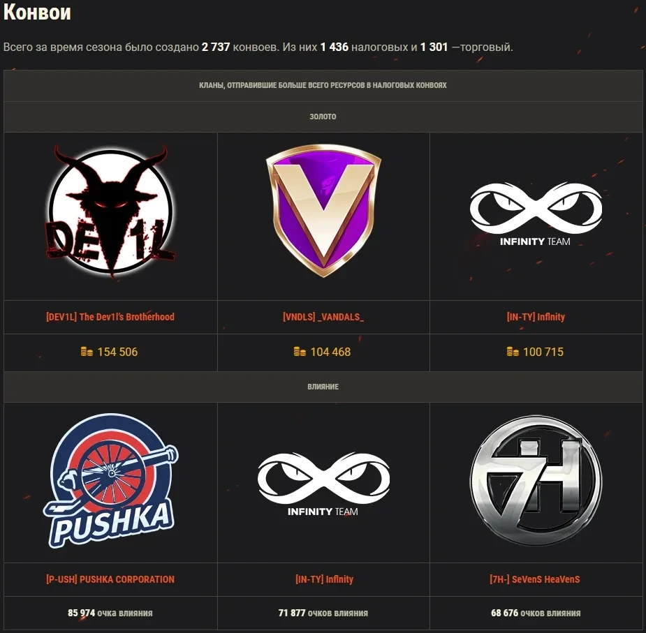 — Кланы, отправившие больше всего ресурсов в налоговых конвоях (Влияние):