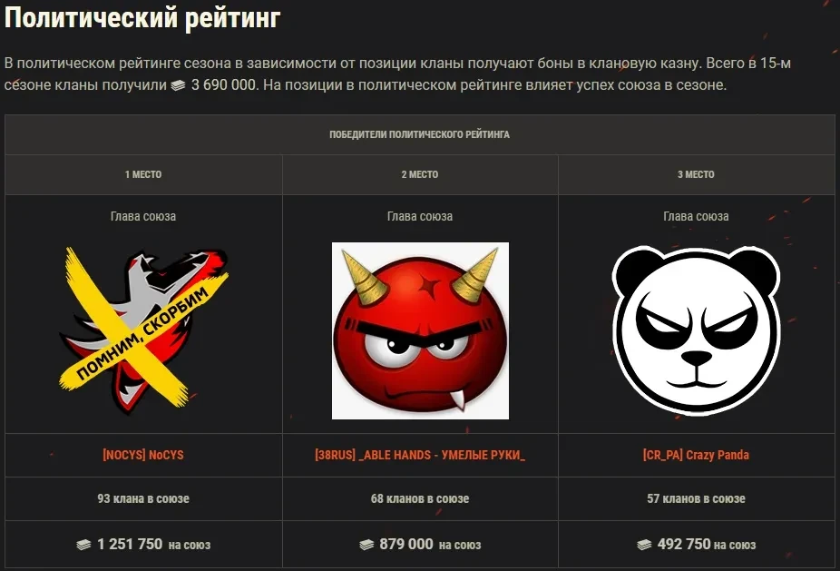 Кланы получат боны в казну в зависимости от позиции в политическом рейтинге на момент завершения 15-го сезона.