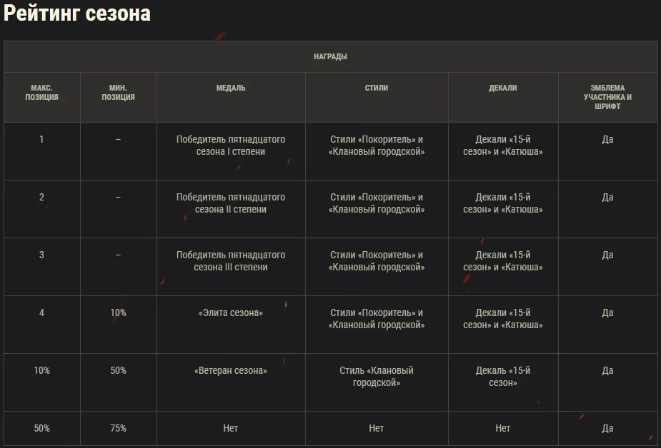Клановую награду получат игроки, состоящие в клане-призёре на момент окончания сезона 28 ноября 5:59 (МСК) и сыгравшие 5 и более боёв на Глобальной карте в 15-м сезоне.