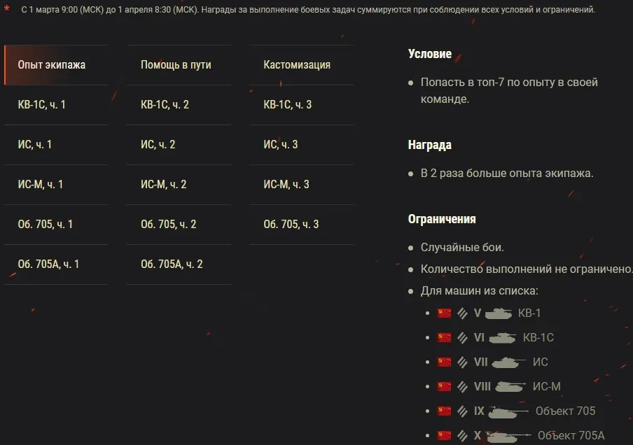 С 1 марта 09:00 (МСК) до 1 апреля 08:30 (МСК). Награды за выполнение боевых задач суммируются при соблюдении всех условий и ограничений.