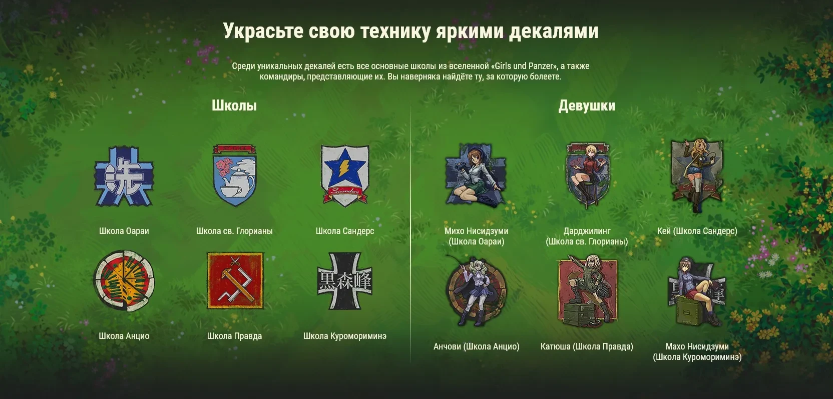 Среди уникальных декалей есть все основные школы из вселенной «Girls und Panzer», а также командиры, представляющие их. Вы наверняка найдёте ту, за которую болеете.