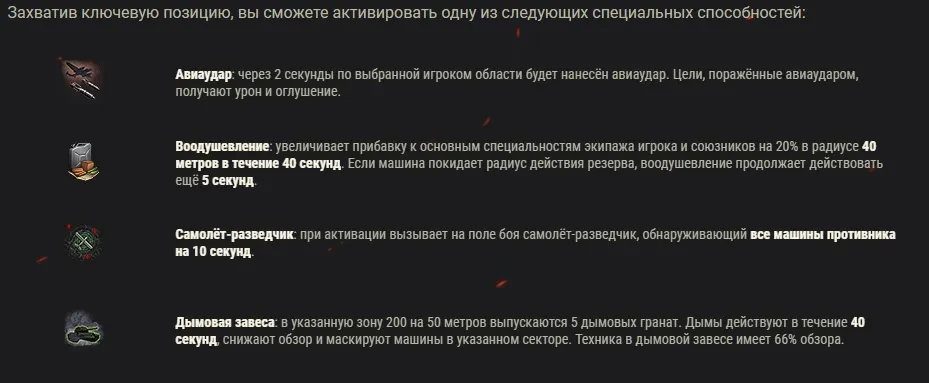 Захватив ключевую позицию, вы сможете активировать одну из следующих специальных способностей: