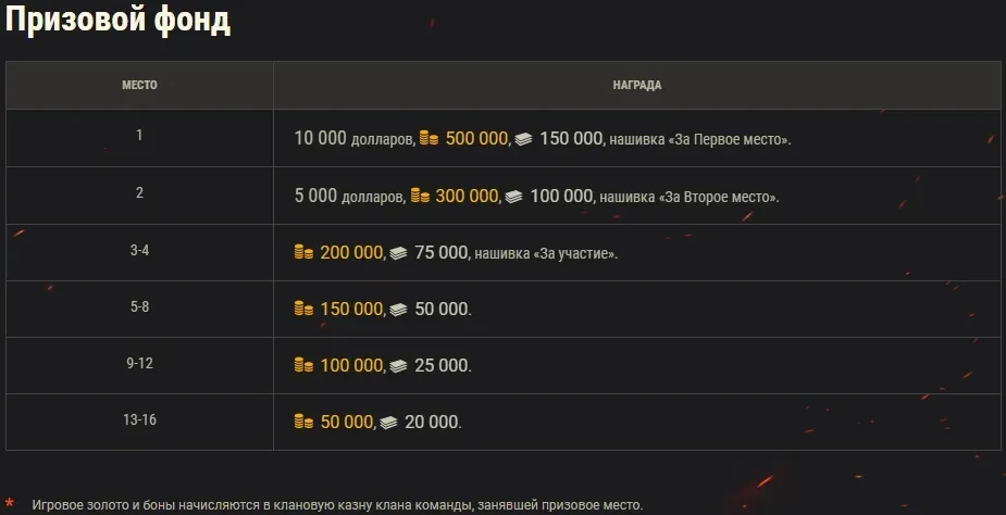 - 1 место: 10 000 долларов, 500 000 gold., 150 000 бон, нашивка «За Первое место».