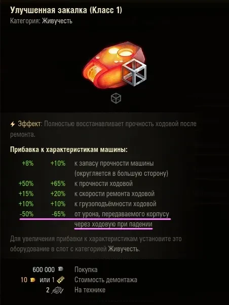 При том условии, что на общем тесте 1.10, когда оборудование 2.0 добавили в игру, Улучшенная закалка снижала урон от падения на 50% с любой высоты и на любую часть танка, а до появления оборудования 2.0 Рессоры так же снижали урон от падения на 50% с любой высоты, но уже при падении только на гусеницы (В подтверждение этому есть видео у Amway921 про эту особенность рессоров: ссылка).