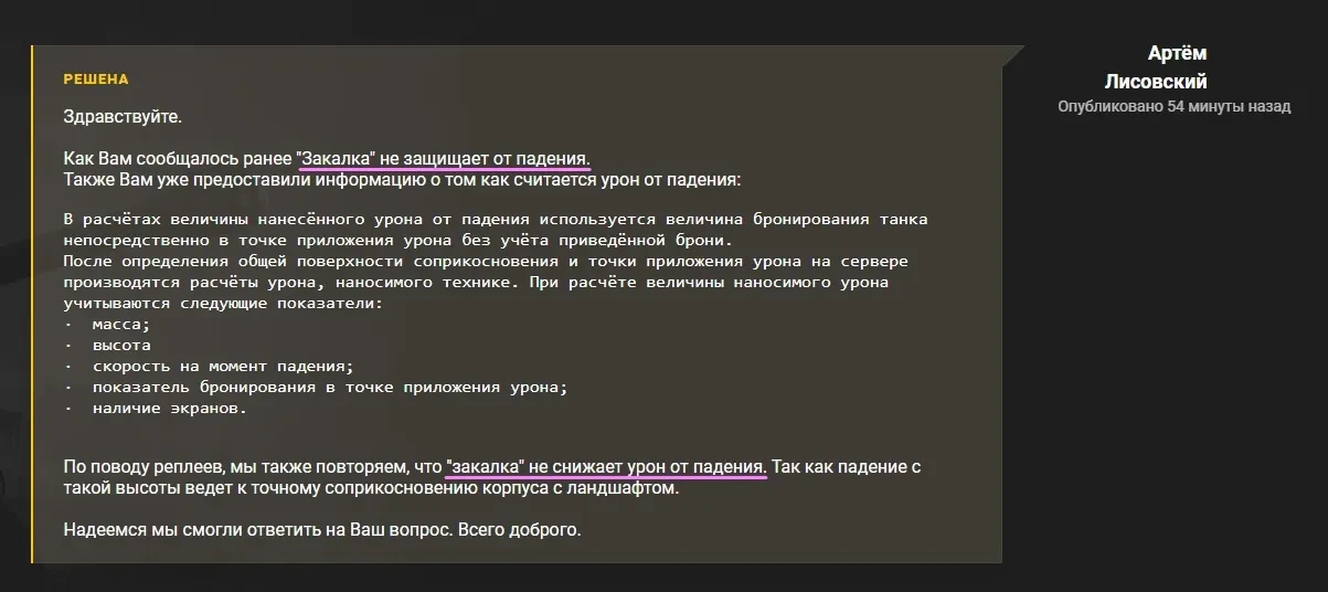 На все реплеи с пруфами ЦПП придумывает миллион отговорок от слишком большой высоты с которой упал танк до того, что танк не ровно на всю ходовую часть приземлился. Ну то есть физику игры в ЦПП видимо тоже не знают и не понимают, что танк просто не может так упасть. По итогу мы имеем закалку, которая от падения не защищает и компоновку, которая не защищает от взрыва Боекомплекта. 2 оборудования в игре, которые работают не так, как написано в клиенте игры, а уникумы из ЦПП с пеной у рта доказывают, что все работает как надо.