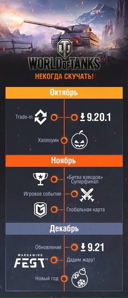 Разработчики WoT официально показали что нас ждет в ближайшее время. Так что не переключайте свой клиент. Например, в этом месяце запустят Trade-in. А последний патч года, как мы и говорили выйдет под номером знаменитого блогера - 9.21