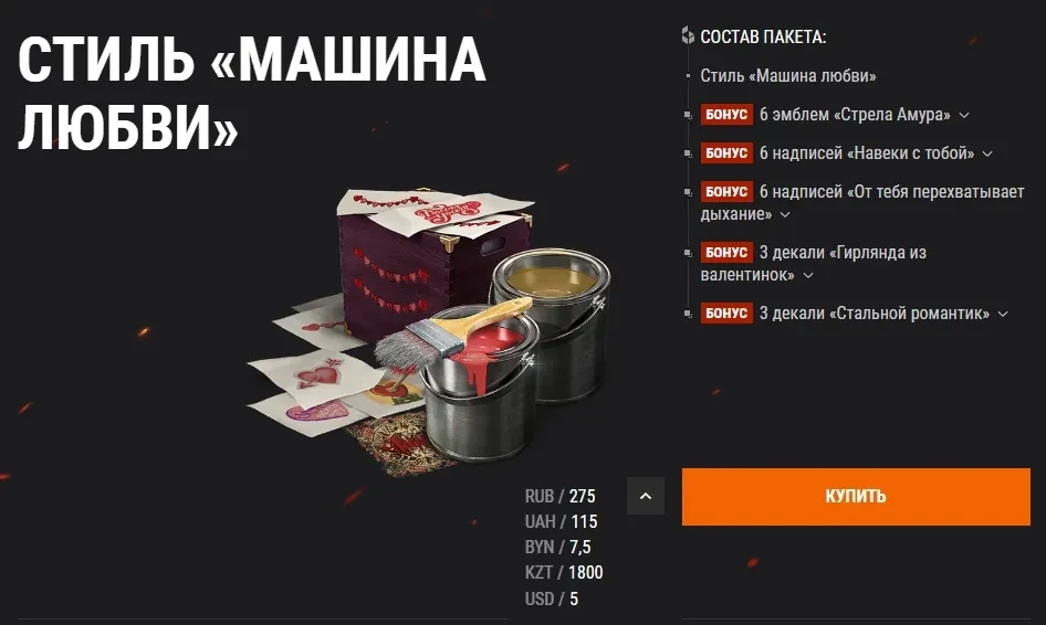 В честь Дня всех влюблённых украсьте своих любимых стальных воинов праздничным 2D-стилем «Машина любви» (ссылка), который специально к 14 Февраля появился в Премиум магазине!