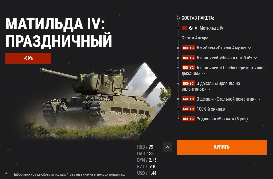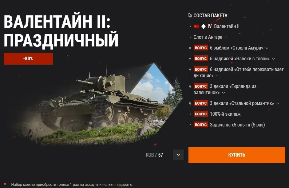 Здесь вы также найдёте предложения с тематическими танками праздника IV Валентайн II и V Матильда IV со скидкой 80%!