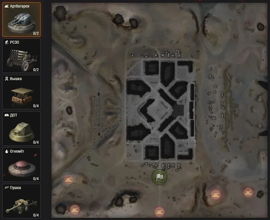 Некоторые оборонительные сооружения самодостаточны, например, артбатарея. Она может стрелять по всей карте и всегда будет поражать цели, пока ваша техника их подсвечивает. Кроме того, у неё приличный собственный радиус обзора. Она будет отлично работать в любом составе отряда.