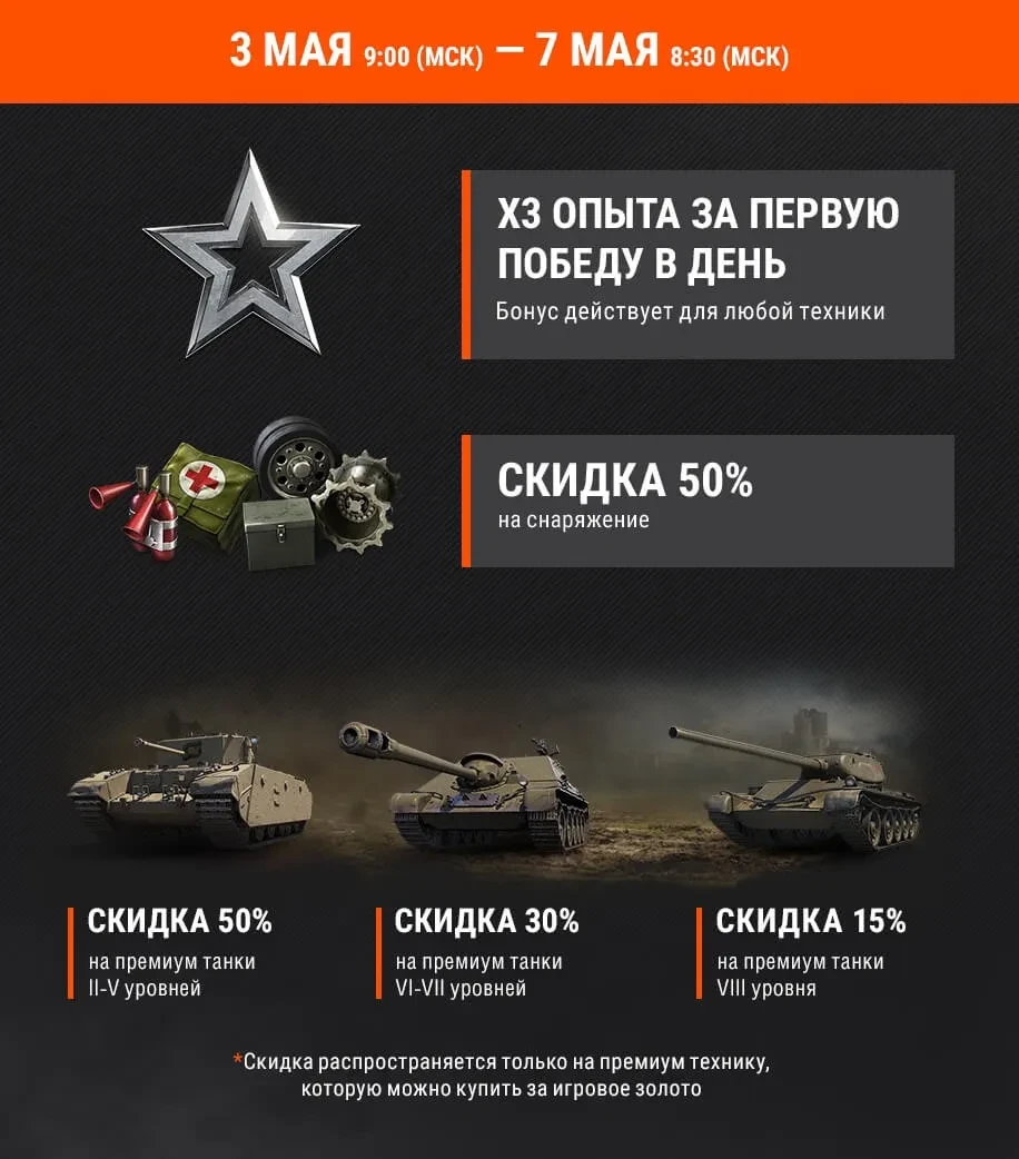 С 3 мая 09:00 (МСК) по 7 мая 08:30 (МСК) в WOrld of Tanks вас ожидает: