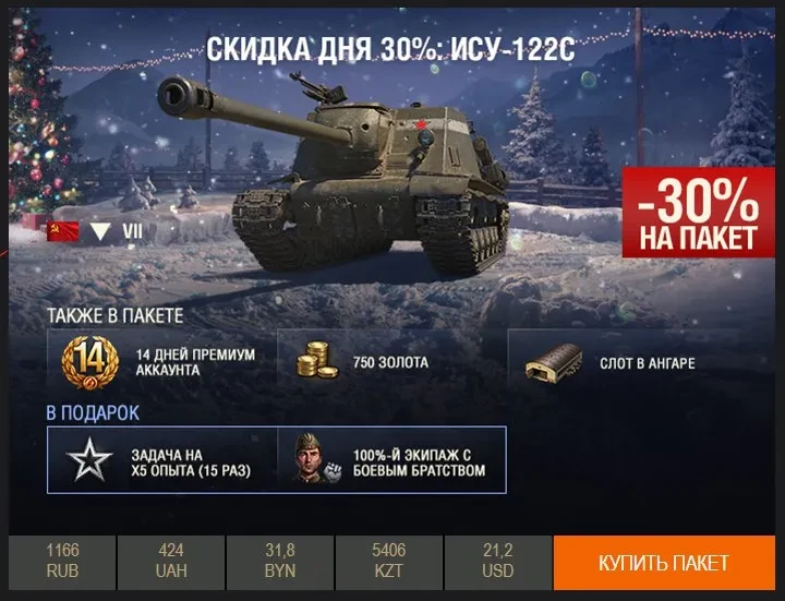 С 19 декабря 8:45 (МСК) до 20 декабря 9:25 (МСК) действует скидка 30% на пакет с ИСУ-122С.