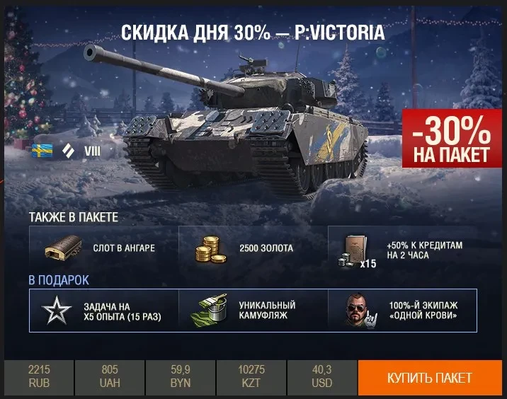 • Если Primo Victoria у вас уже есть, то при покупке пакета вам будут начислены экипаж, слот в Ангаре, игровое золото, личные резервы и боевая задача, а вместо машины — 9 750 золота.