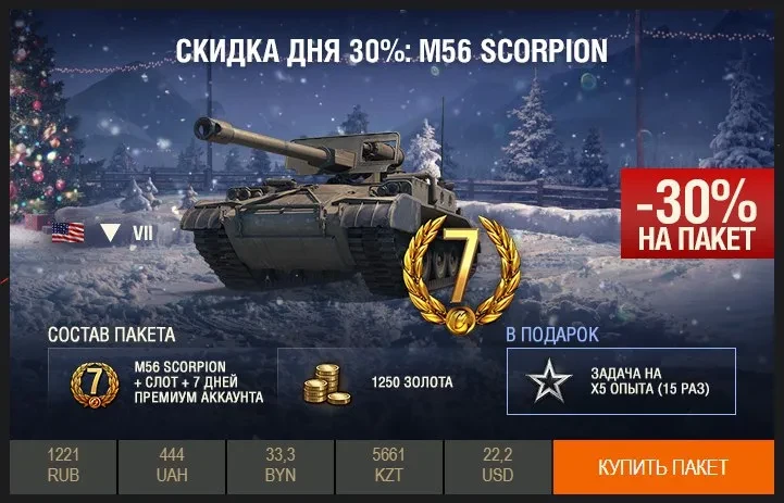 Если M56 Scorpion у вас уже есть, то при покупке пакета вам будут начислены слот в Ангаре, игровое золото, премиум аккаунт и боевая задача, а вместо машины — 5 150 золота.