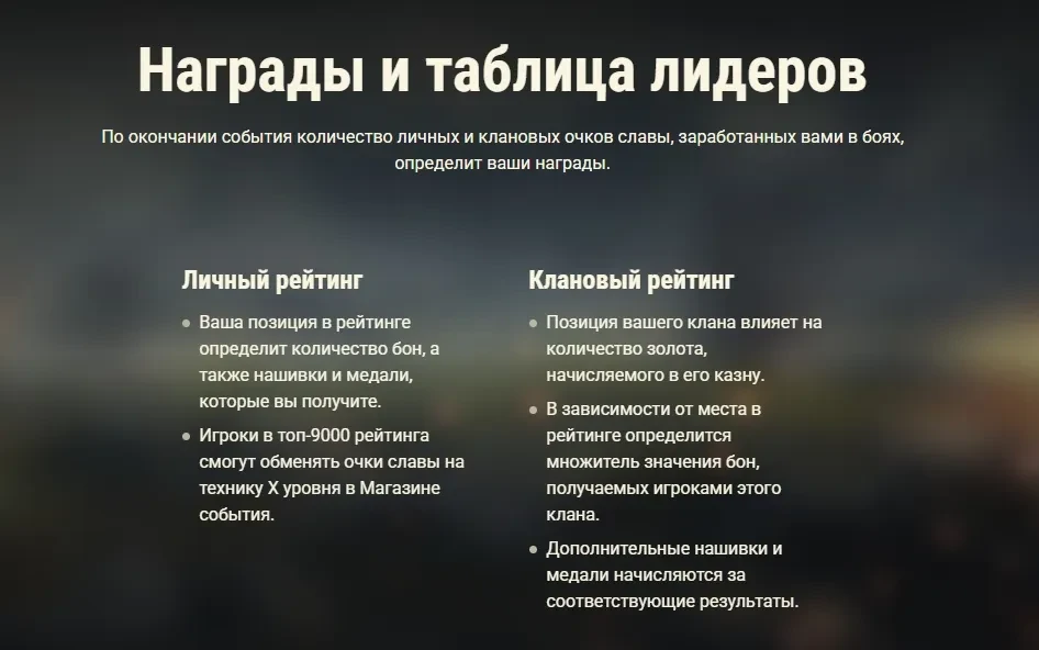 По окончании события количество личных и клановых очков славы, заработанных вами в боях, определит ваши награды.