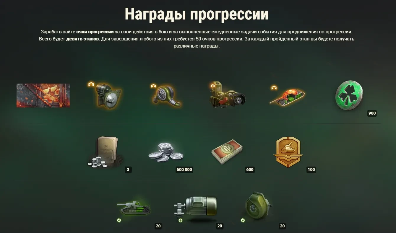 Зарабатывайте очки прогрессии за свои действия в бою и за выполненные ежедневные задачи события для продвижения по прогрессии. Всего будет девять этапов. Для завершения любого из них требуется 50 очков прогрессии. За каждый пройденный этап вы будете получать различные награды.