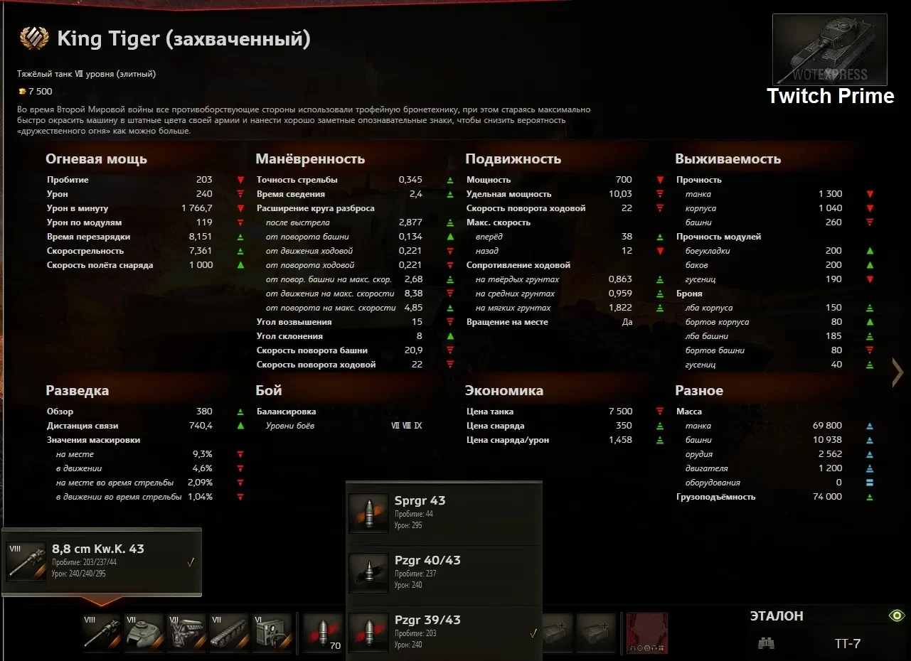 - King Tiger (захваченный) в русской локализации [США, ТТ-7, прем танк]. Данная машина станет уникальным танком под акцию «Прямой эфир» в World of Tanks. Получить его можно будет как и 4 пакета Twitch Prime ранее, просто оформив подписку «Prime» на видеостриминговом сервисе Twitch любым способом. Танк является эксклюзивом как и Т-44-100 (Р) и будет распространяться по такой же схеме. По другому King Tiger (захваченный) никак получить будет нельзя, эксклюзив.
