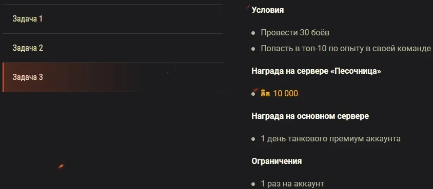 Во время второго теста оборудования 2.0 для вас будут доступны специальные боевые задачи в случайных боях на сервере «Песочница». За их выполнение вы можете получить 1 день танкового премиум аккаунта на основном сервере.