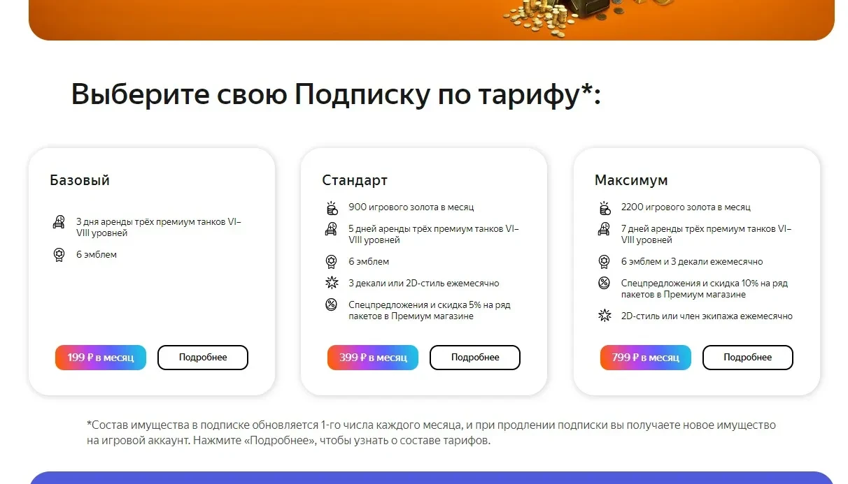 В рамках подписки Яндекс Плюс World of Tanks вам доступны на выбор три тарифа. Каждый из них содержит все стандартные преимущества Яндекс Плюса для вашей страны, а также следующее внутриигровое имущество World of Tanks: (см. картинку 2).