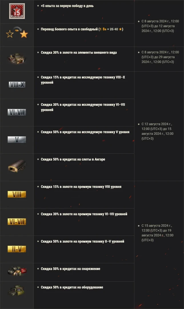 Во время празднования дня рождения WoT вы можете воспользоваться приятными скидками на исследуемую и премиум технику, множество элементов внешнего вида и другие товары. Мы собрали все скидки и бонусы в одной таблице. Они будут активны в разные дни, поэтому заходите в игру каждый день!