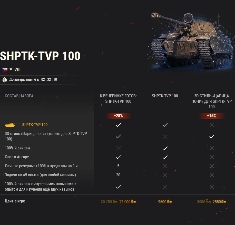 Среди новых предложений этой недели — грозная ПТ-САУ VIII ShPTK-TVP 100, проворный ЛТ VIII ELC EVEN 90 и мощный ТТ VIII Caliban. Добавьте эти машины в свою коллекцию и оставьте следы гусениц на полях сражений! Это ещё один шанс приобрести за золото личные резервы на кредиты и задачи на ×5 опыта для любой техники.