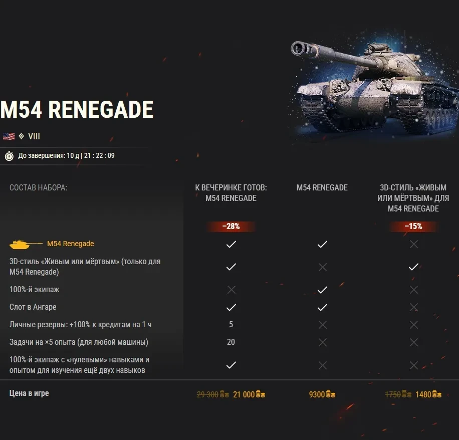 На этой неделе в праздничной тройке — грозный VIII M54 Renegade, стойкий VIII 56TP и впечатляющий VIII Lansen C. Как и ранее в этом месяце, вместе с техникой также можно получить личные резервы на кредиты и задачи на ×5 опыта для любой машины. Всё, что вам нужно, — это золото! И наконец, у вас есть возможность порадовать себя почти годом Танкового премиум аккаунта с 20%-й скидкой. Не упустите эксклюзивные предложения и прокачайте любимую технику, чтобы покорять поля сражений!