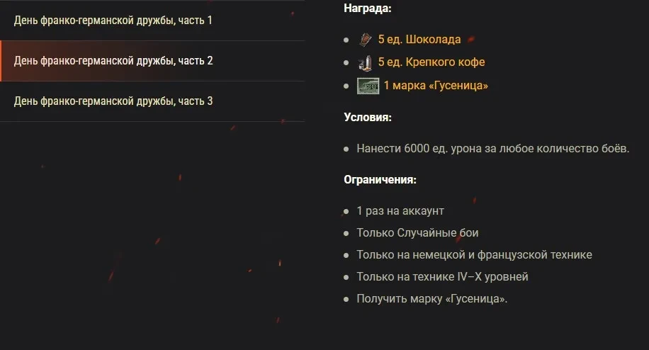 Испытайте свои новенькие танки Германии и Франции в сражениях или же выходите в бой на давних любимцах и выполните цепочку из трёх боевых задач. Неважно, опытный вы ветеран или же новичок в игре, — эти задачи как нельзя лучше подходят для проверки навыков и заработка приятных наград, среди которых особый 2D-стиль «Наш общий праздник».