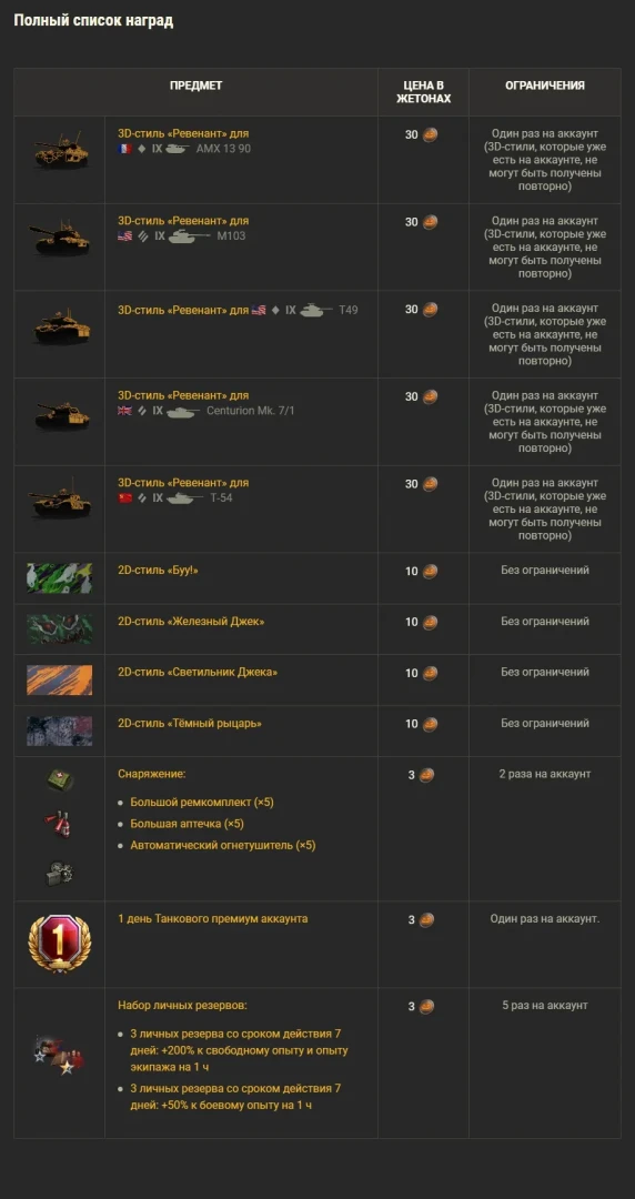 - 5 личных резервов: +50% к боевому опыту на 1 ч (срок действия 7 дней)
