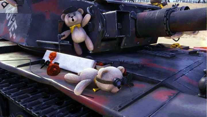 - де весь танк в красных пятнах, а на броне висять ихни трупы...