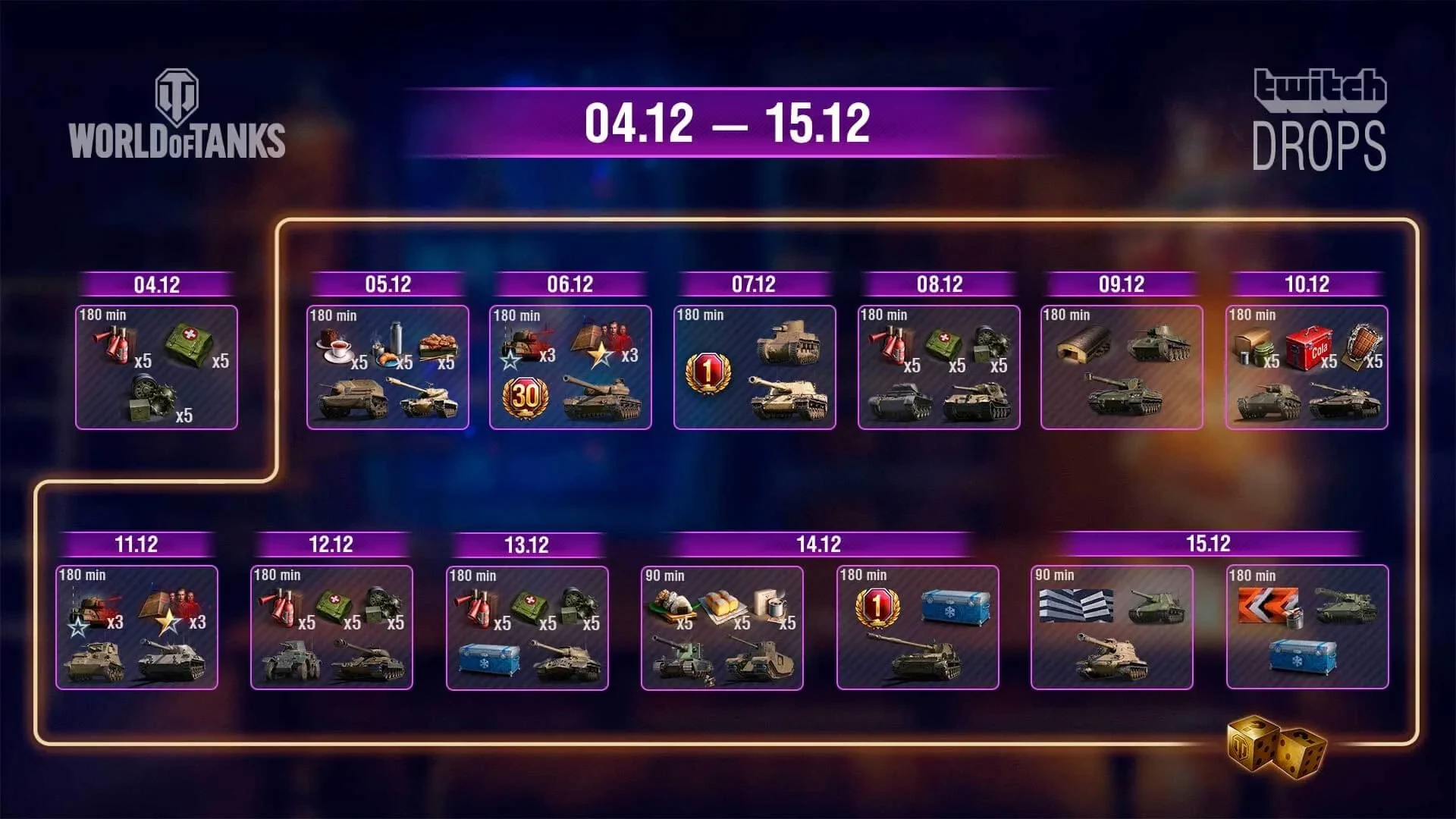 Смотрите ежедневные трансляции на официальном Twitch-канале World of Tanks и получайте новый Twitch Drop в каждый из «12 дней праздников»! Заходите за секретными Twitch Drops! Счастливчики получат большие коробки, 3D-стиль и премиум технику: VIII T77, VIII Škoda T 56 , VIII Bofors Tornvagn, VIII HWK 30, VIII Type 63 и многое другое.