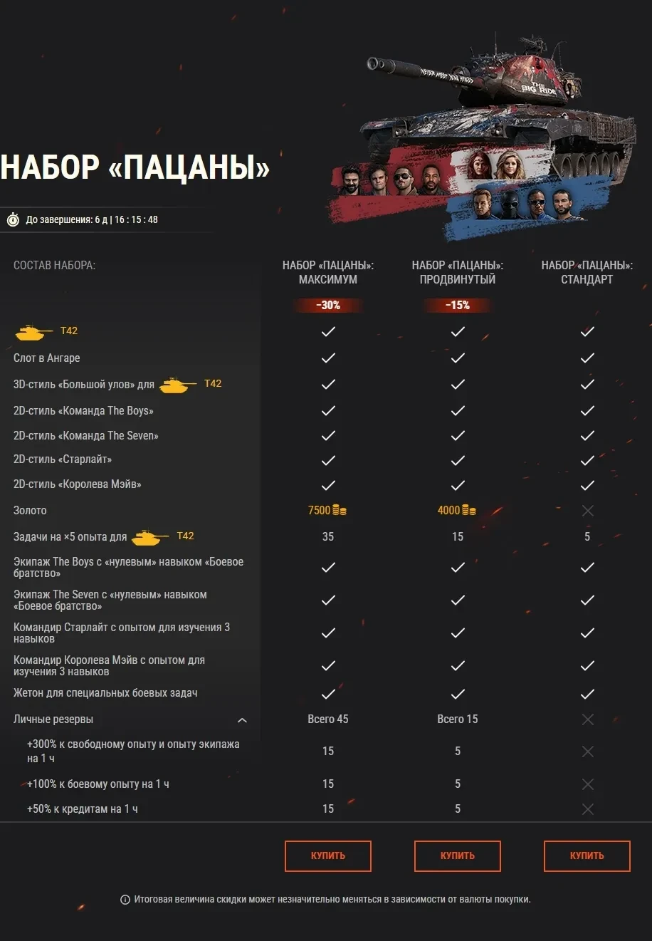 Отправляйтесь в Премиум магазин и заполучите набор с VIII T42 и его эксклюзивным 3D-стилем «Большой улов». Украсьте этот американский средний танк отсылками к полюбившемуся сериалу «Пацаны» и творите беспредел на полях сражений не хуже некоторых «супергероев». Каждый набор включает: