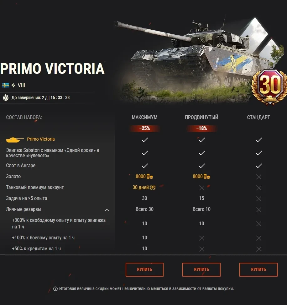 Любите хеви-метал и World of Tanks? Тогда вам понравится наше новое предложение! До 11 ноября в Премиум магазине вас будут ждать VIII Primo Victoria и IX Strv K с участниками группы Sabaton в качестве членов экипажа, а также множество других тематических предметов. Ниже вы можете ознакомиться со всеми наборами, спецпредложениями и элементами внешнего вида.