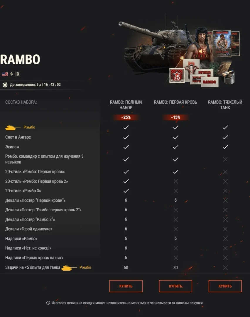С 10 по 20 июля вас ждут потрясающие наборы, созданные в рамках специальной коллаборации с самим Рэмбо. В наборы входят элементы внешнего вида, члены экипажа и танк IX Рэмбо, вдохновлённые культовой трилогией, навсегда изменившей жанр боевиков.