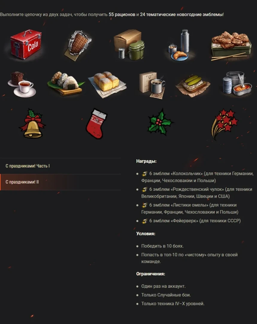 Чем больше праздничных событий, тем веселее! С 22 по 26 декабря у вас есть возможность заполучить эксклюзивные бонусы, а также ценные награды за выполнение боевых задач. Участвуя в событии «Праздничная лихорадка», вы получаете: