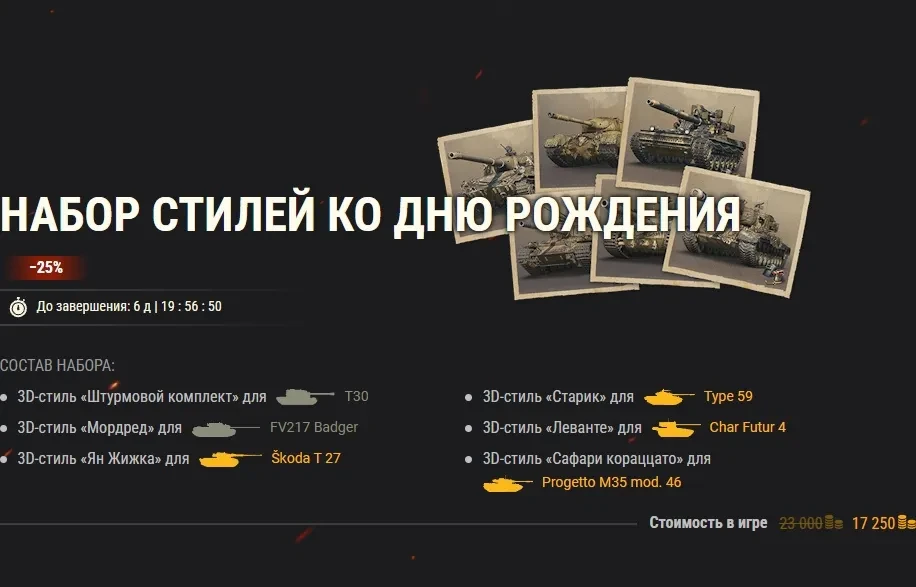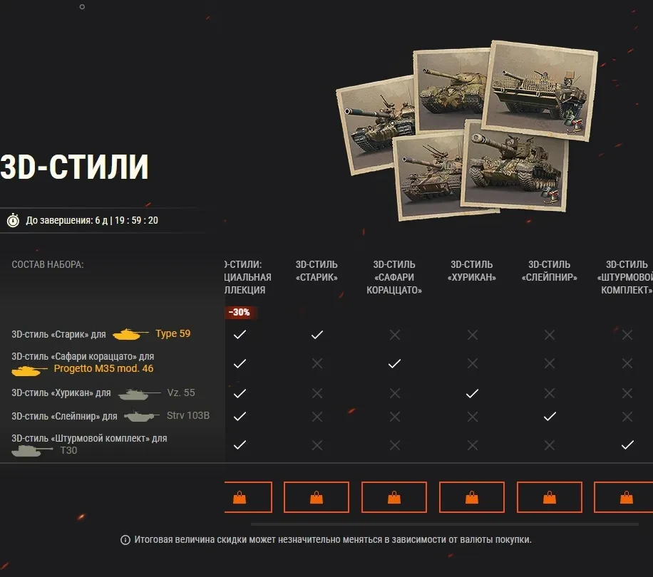 Вас ждут по-настоящему ценные товары, среди которых грозная VIII XM66F, легендарный VIII Type 59 и всеми любимый VIII Progetto M35 mod. 46, а также уникальные 3D-стили, в том числе дерзкий «Штурмовой комплект» для IX T30 и легендарный «Хурикан» для X Vz. 55.