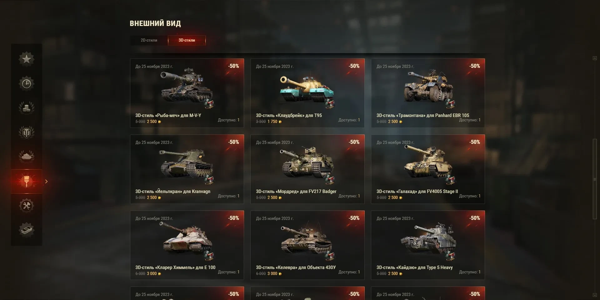 До 25 ноября 2023 г. во внутриигровом магазине в разделе 3D-стилей большие скидки: