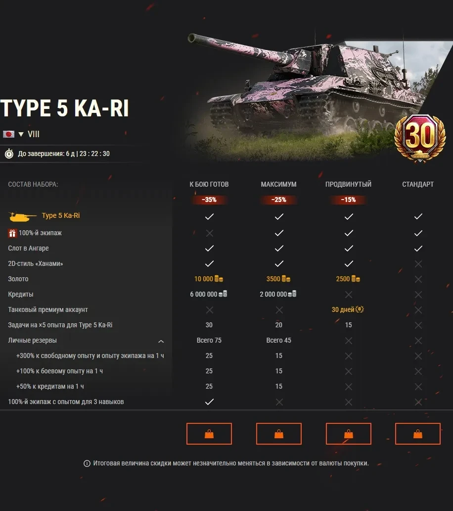 Первая японская премиум ПТ-САУ возвращается в Премиум магазин, а вместе с ней в продаже появятся два её мощных боевых товарища! Обратите противника в бегство, выехав в бой на грозной VIII Type 5 Ka-Ri в 2D-стиле «Ханами», установите господство благодаря крепкому VIII Объект 252У и станьте мастером на все руки с проворным VI M4A1 FL 10.