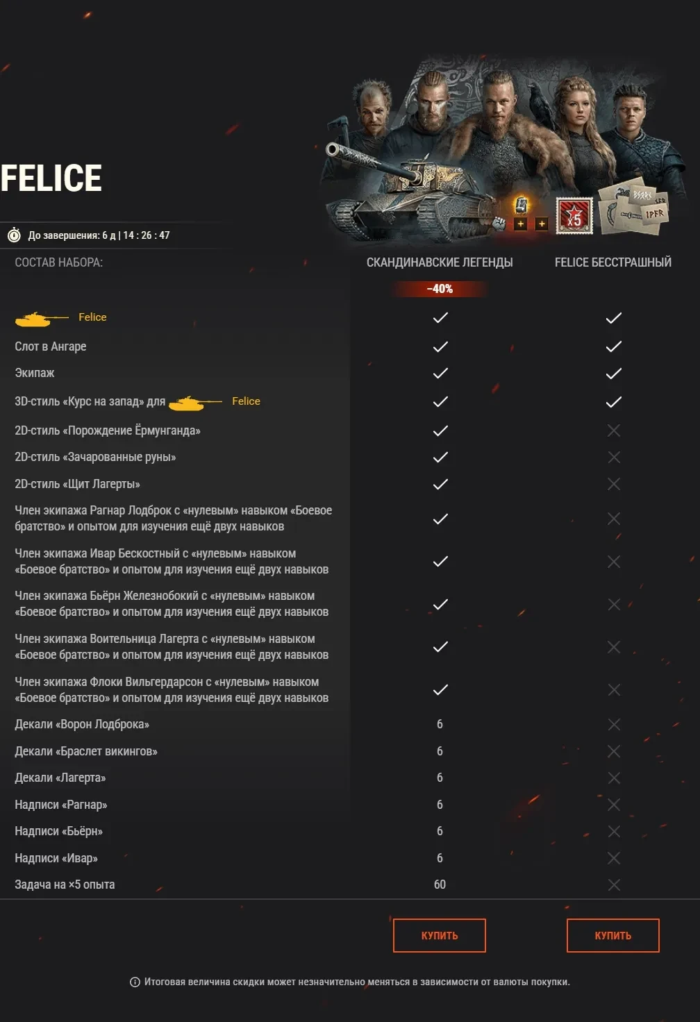 Легендарные воины из сериала «Викинги» вновь прибыли на поля сражений World of Tanks с покрытых льдом северных берегов. С 22 по 29 сентября врывайтесь в бой на грозном IX Felice, рекрутируйте прославленных воинов Севера и украшайте технику невероятными элементами внешнего вида в скандинавском стиле. Выпустите на волю своего внутреннего варяга и добудьте славу на поле брани!