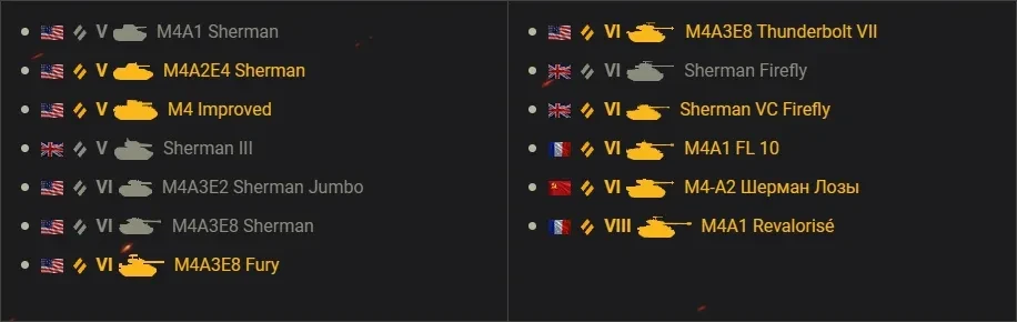 Сейчас в игре 13 машин, которые являются различными версиями танка M4 Sherman или созданы на его основе. Они представляют четыре игровые нации, поскольку «Шерманы» в больших количествах поставлялись союзникам США во время и после Второй мировой войны.